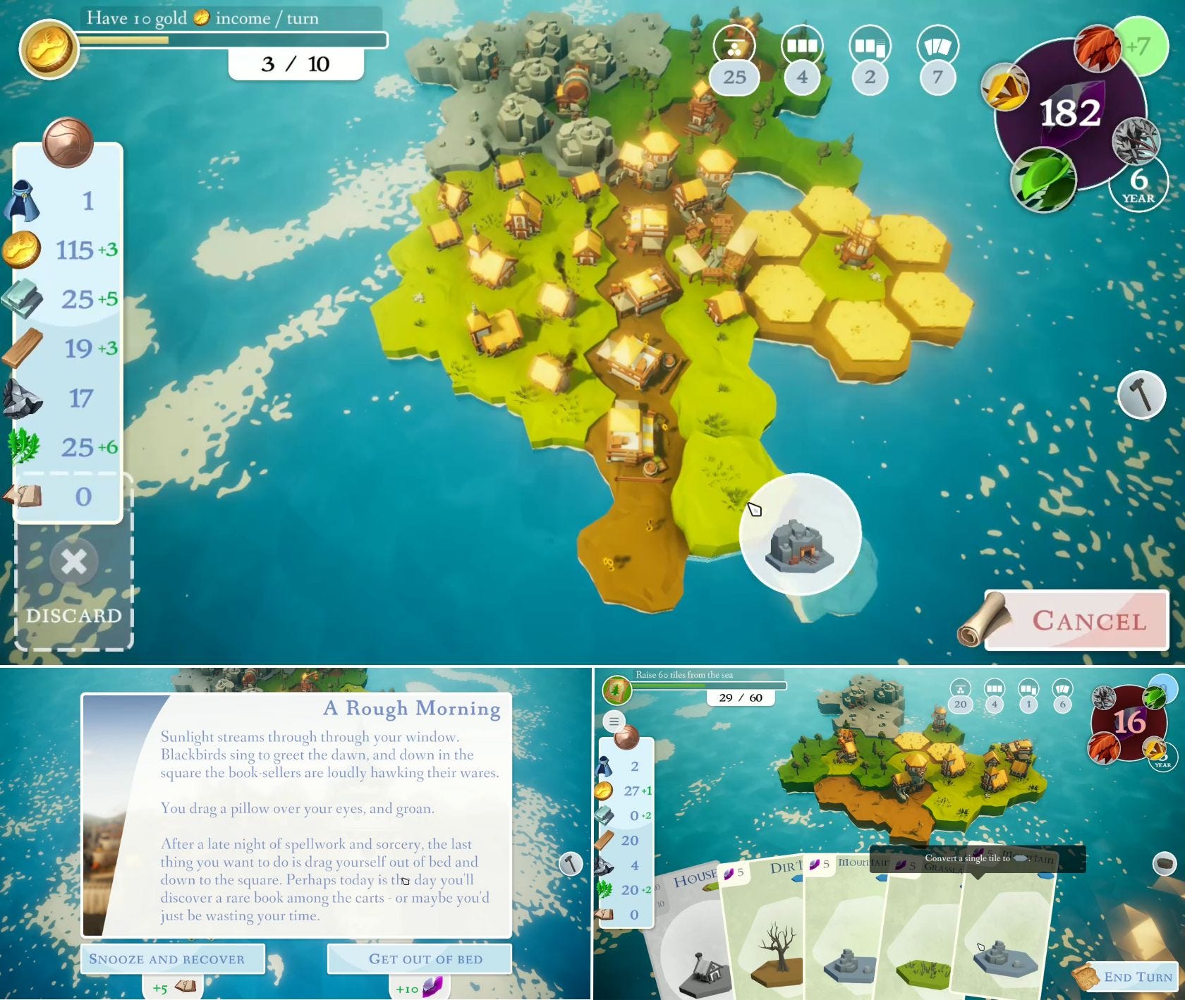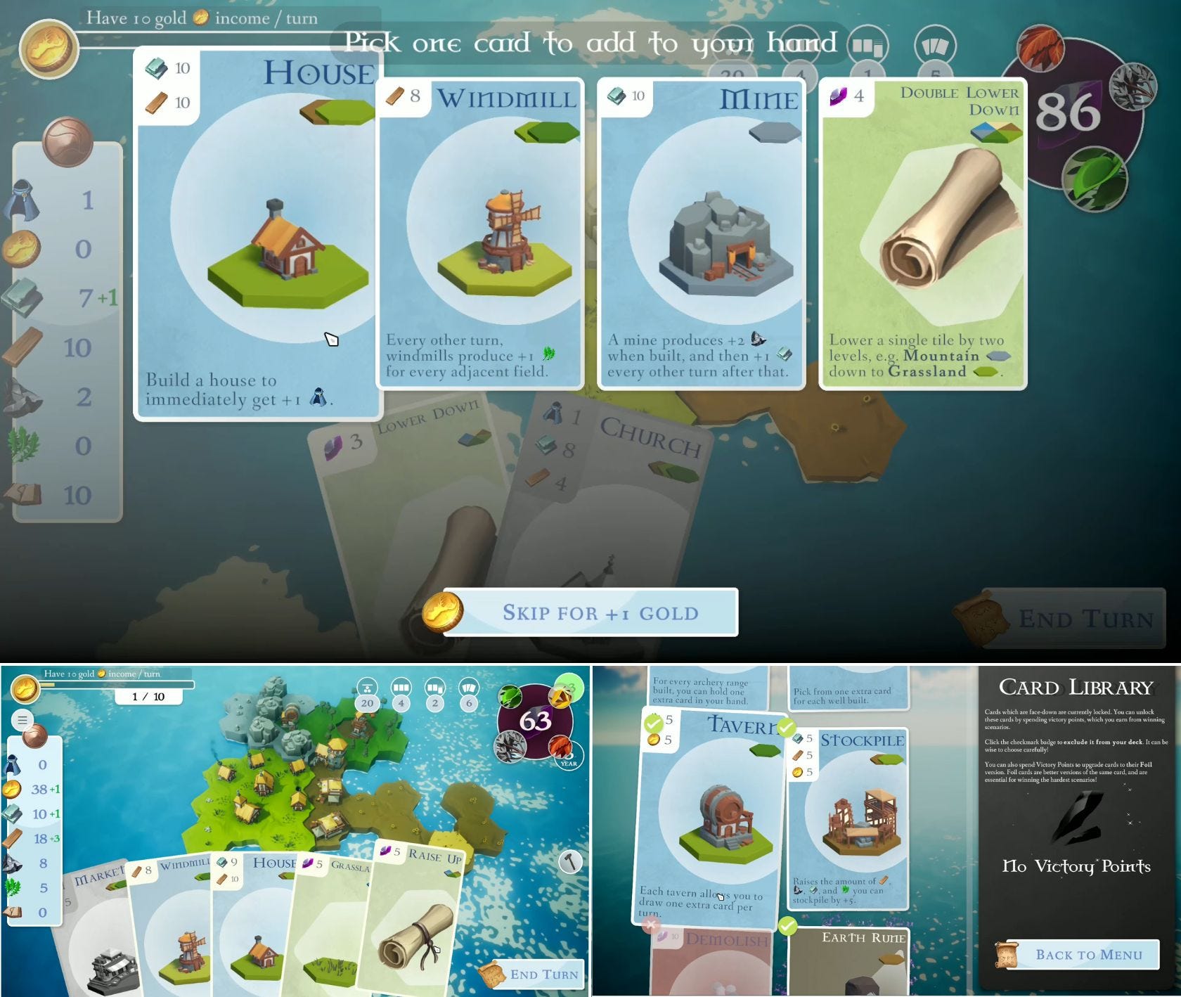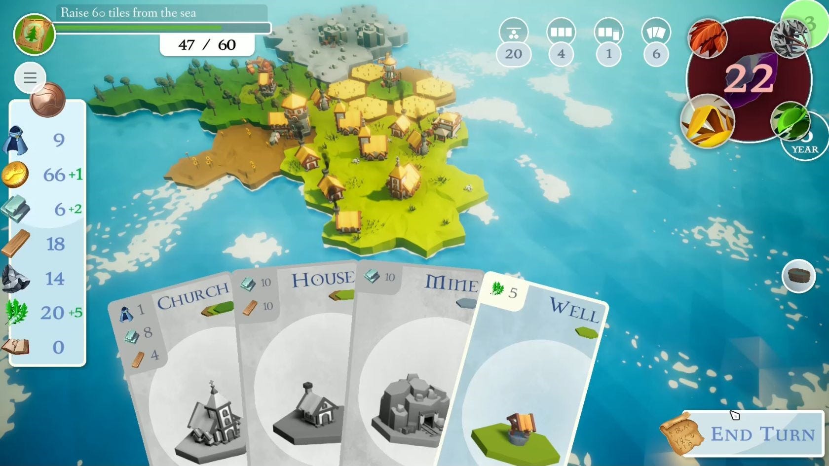 You start a game with a hand of cards. Every turn, you can add a new card from a selection drawn from your deck. The cards represent land tiles, buildings, or special abilities. Playing a card lets you do something: place land, erect a building, or use a special ability, such as changing a tile type.